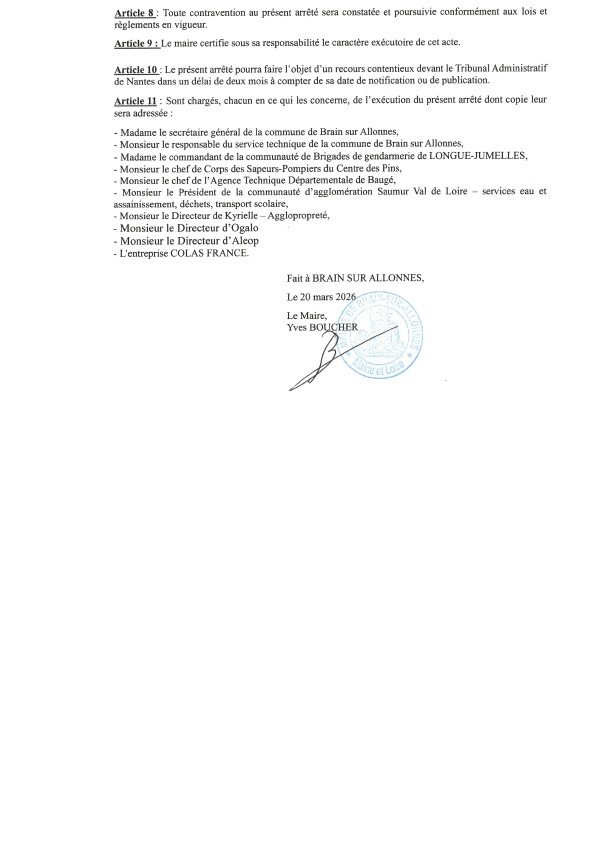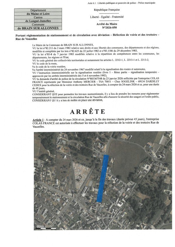 Vous trouverez ci-joint lâarrĂȘtĂ© du maire n°2026-050 en date du 20 mars 2026 portant rĂ©glementation de stationnement et de circulation avec dĂ©viation â RĂ©fection de voirie et des trottoirs â Rue de Vauzelles â A compter du 24 mars 2026.