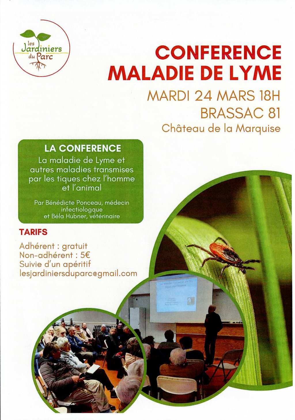 L’association Les Jardiniers du Parc vous invite à une conférence sur la maladie de Lyme et les autres maladies transmises par les tiques, chez l’homme et l’animal.