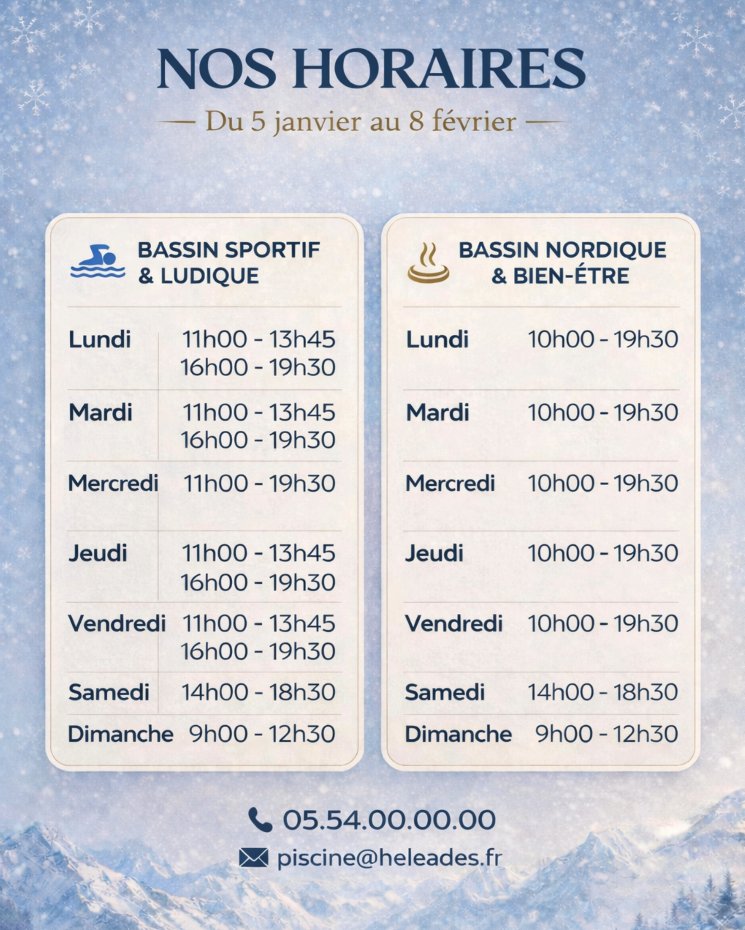 🗓 Horaires d'ouverture du 05 janvier au 08 février