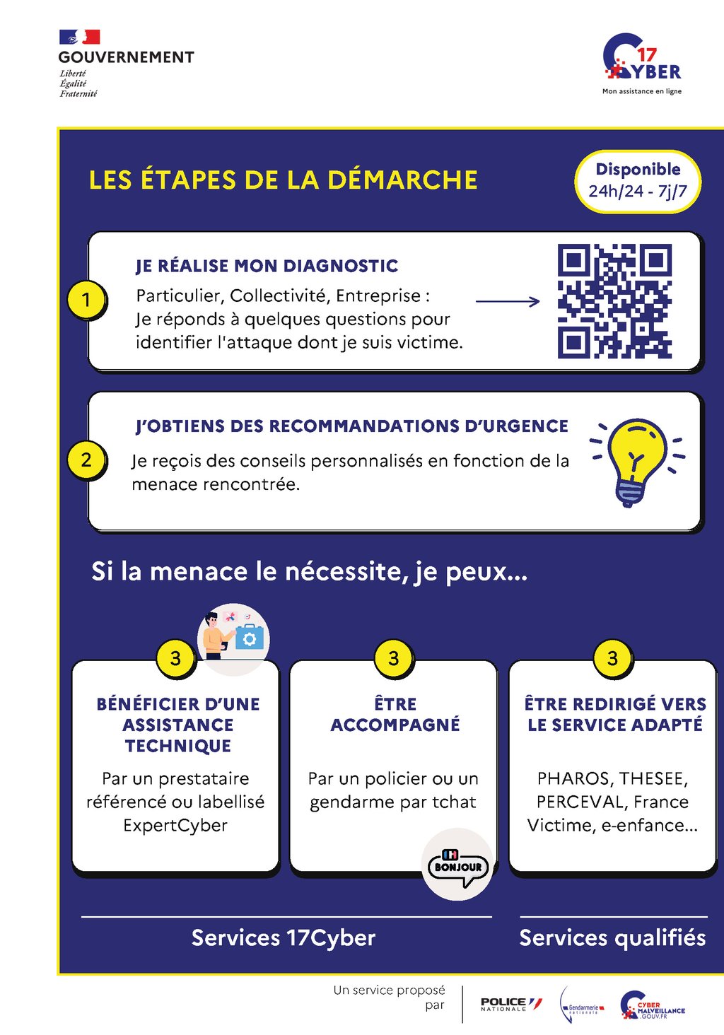 En cas de doute, de question ou si vous êtes victime d’un incident en ligne (arnaque, piratage, usurpation…), 17Cyber vous accompagne à chaque étape.