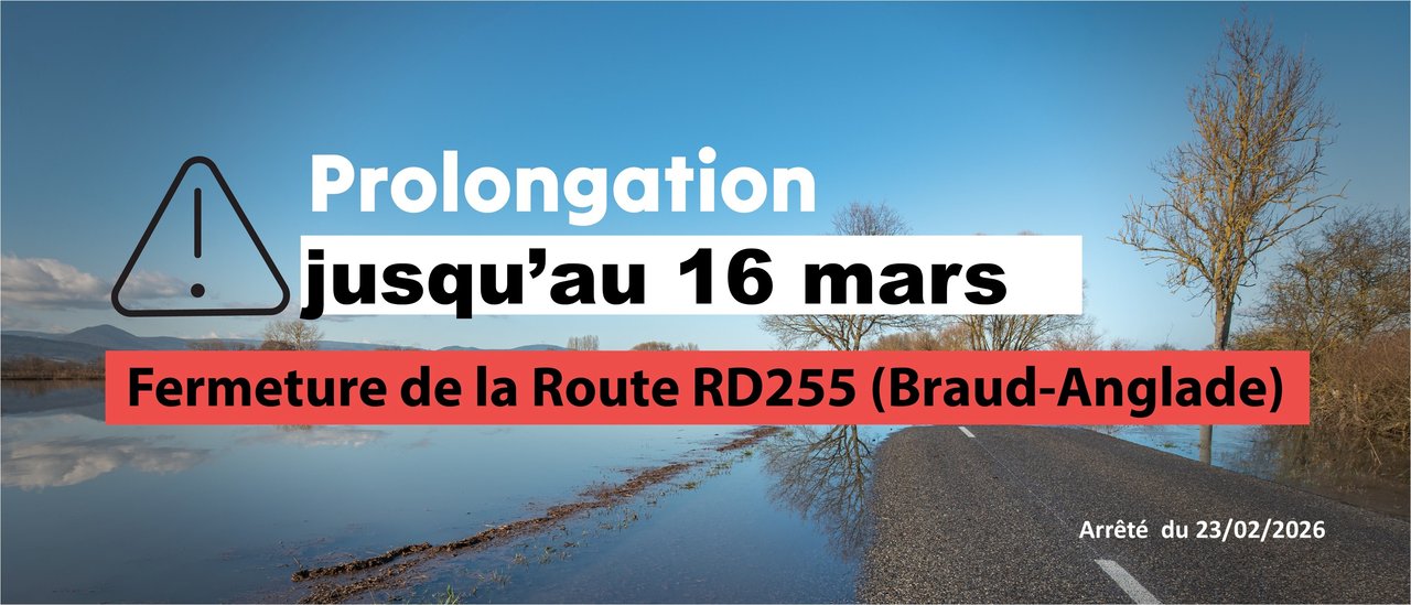 🚧Par mesure de sécurité, il est nécessaire de prolonger la fermeture de la RD255 jusqu’au 16 mars 2026 inclus, suite à l'inondation de la chaussée et à la lente baisse du niveau de l'eau.