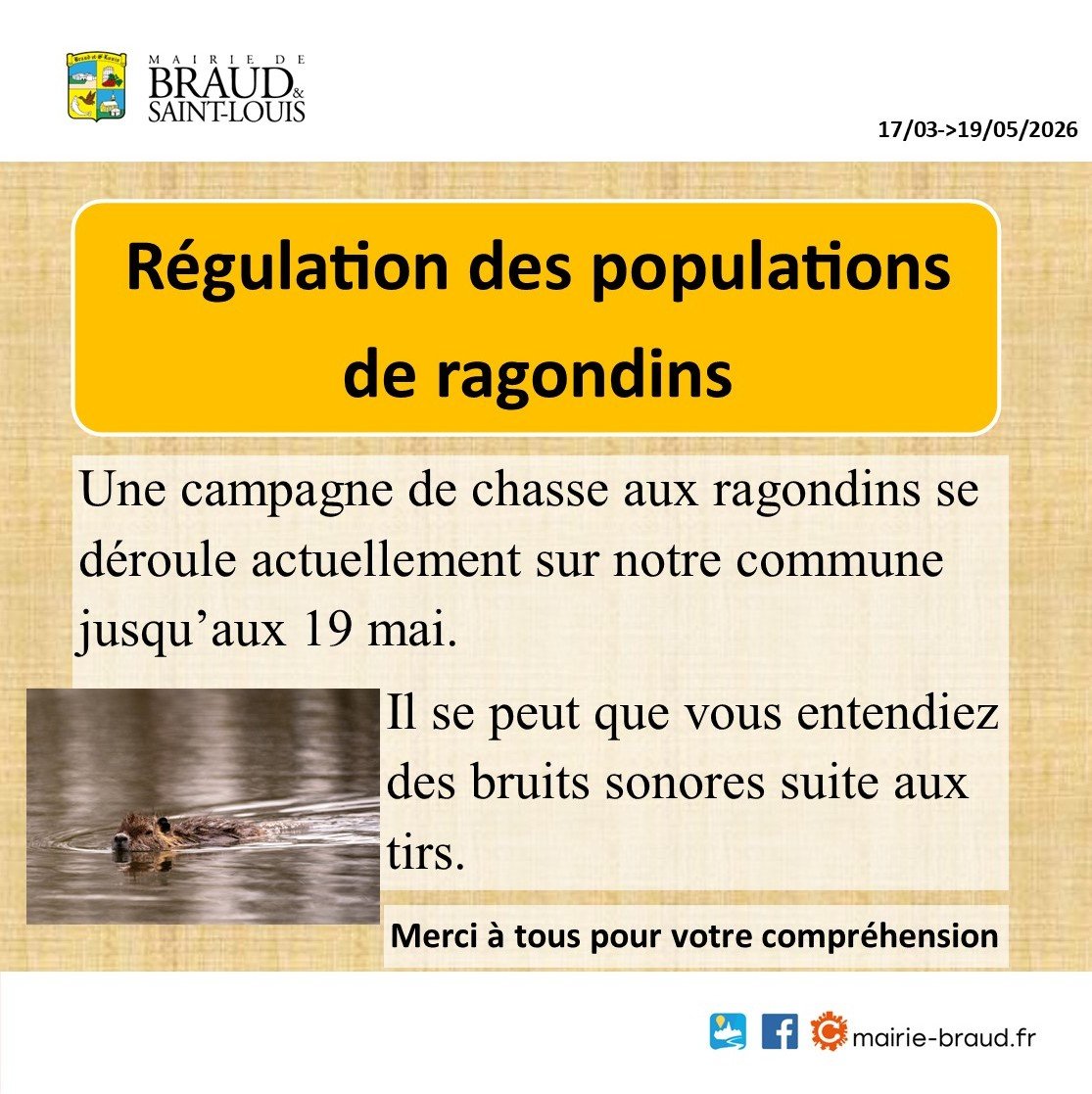 Régulation de la population de ragondins jusqu'au 19 mai 2026.