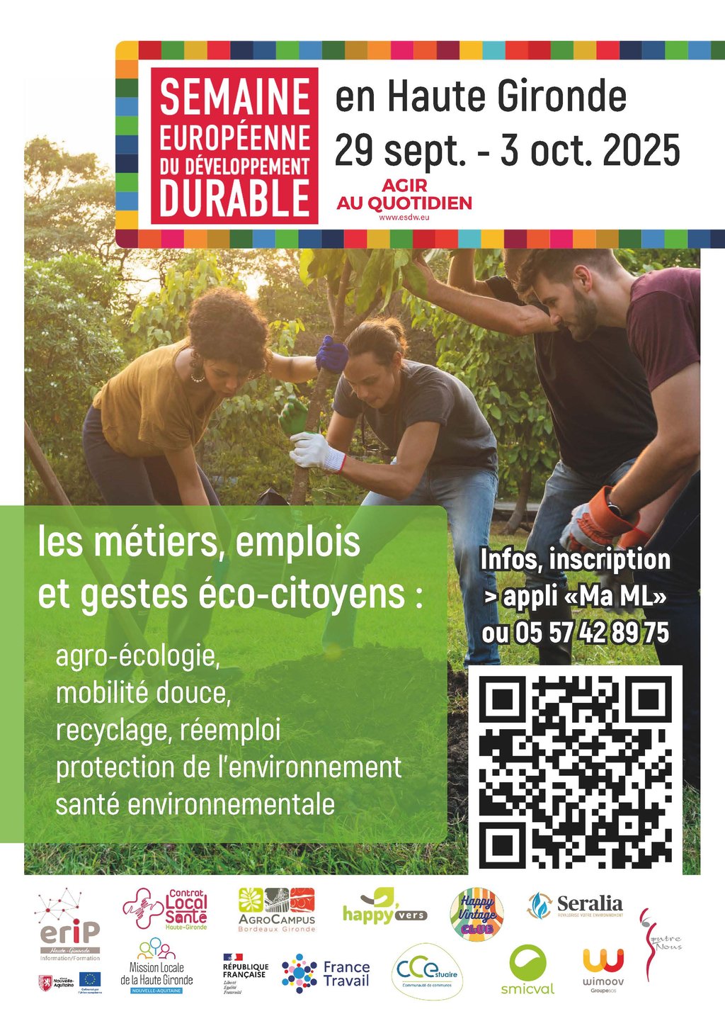 👉 Du 1er au 3 octobre, la Mission Locale de Haute Gironde et ses partenaires vous invitent à découvrir des ateliers, visites et animations autour de l’écologie, de l’emploi et des gestes éco-citoyens.
