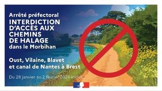 Suite aux crues intervenues sur plusieurs cours d’eau du Morbihan ces derniers jours, et qui ont pu fragiliser voire dégrader les abords de ceux-ci, le préfet du Morbihan a pris ce 28 janvier 2026, un arrêté d’interdiction d’accès aux chemins de halage de l’Oust, de la Vilaine, du Blavet et du canal de Nantes à Brest entrant en application à compter de ce mercredi 28 janvier 2026 à 18h et jusqu’au lundi 2 février 2026 inclus.