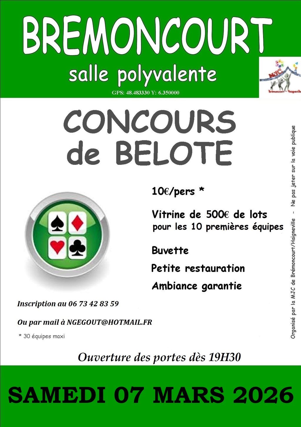 La MJC de Brémoncourt/Haigneville organise son concours de belote le samedi 07 mars 2026 à la salle polyvalente de Brémoncourt.