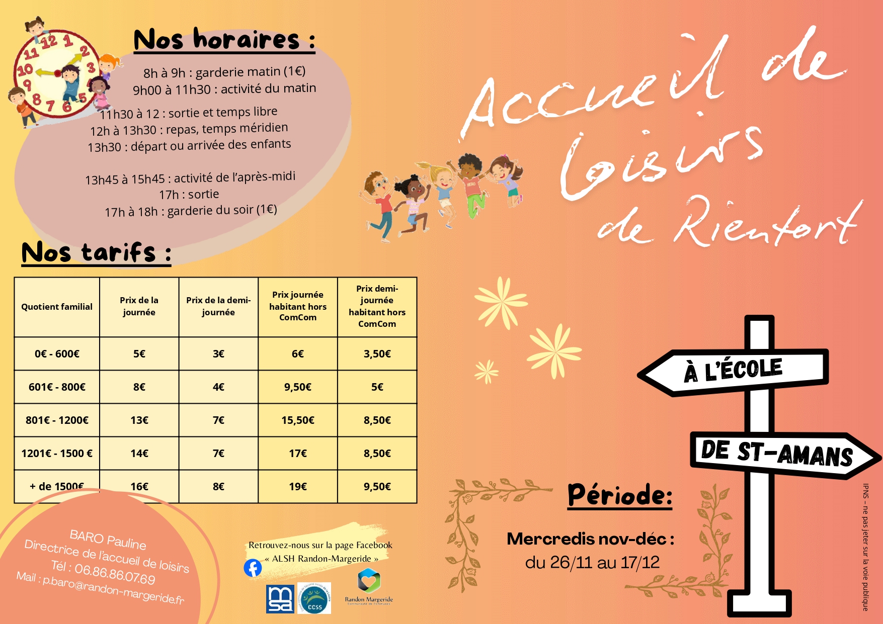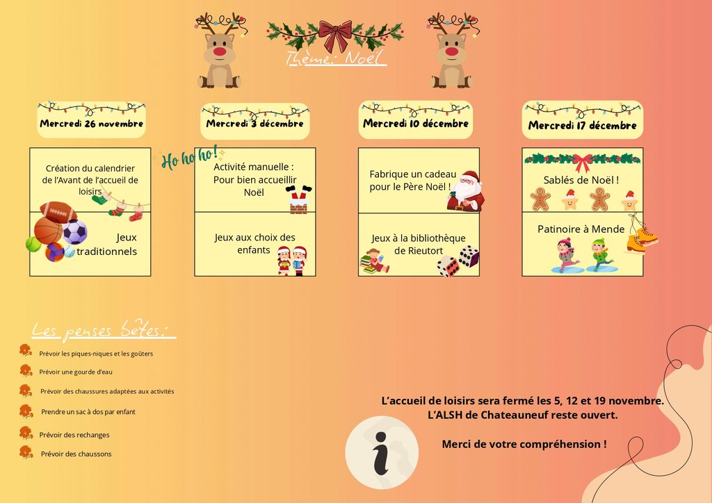 L'accueil de loisir sera fermé les 5, 12 et 19 novembre.