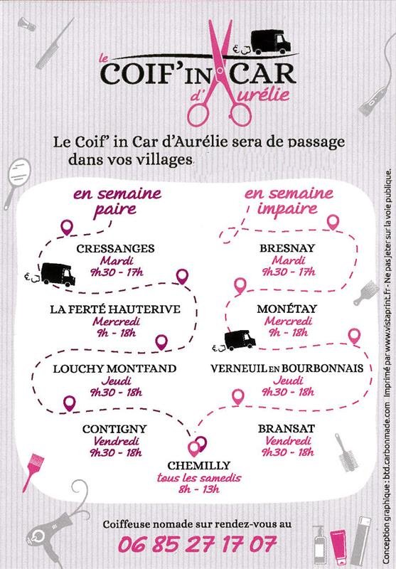 Retrouvez Aurélie et son Coif'in'Car à Bresnay, les mardis, une semaine sur deux.