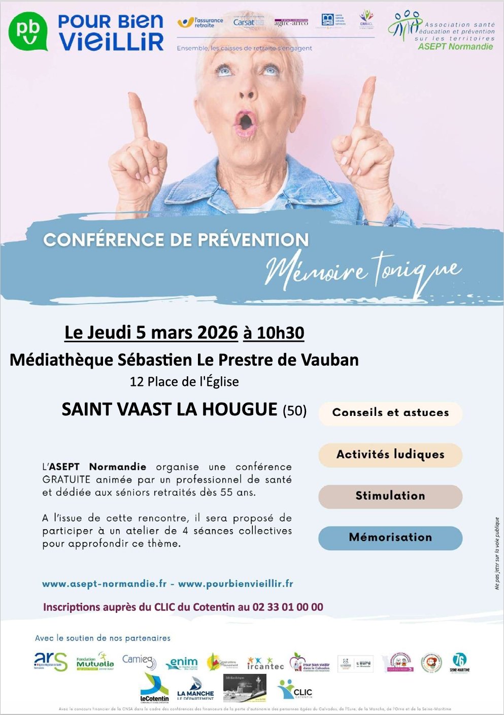 • Le jeudi 5 mars à 10h30, conférence « mémoire tonique » avec l’ASEPT Normandie et la médiathèque de Saint-Vaast-la-Hougue. Des questions sur la mémoire, son fonctionnement, son entretien… Cette conférence sera suivie de 4 ateliers sur inscription le jour même.