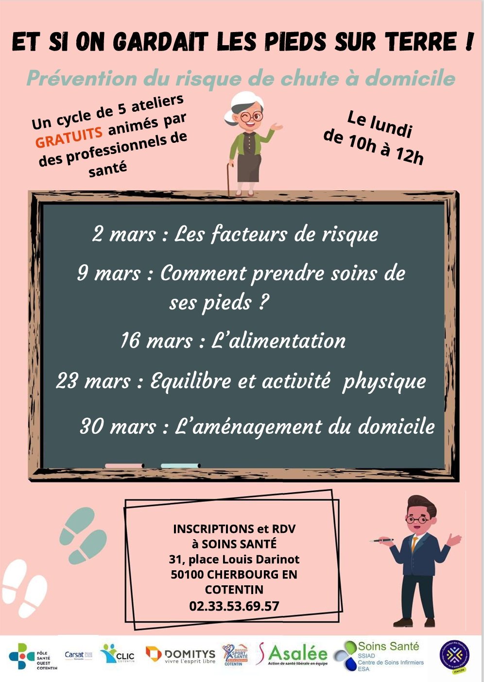- L’association Soins Santé organise un cycle « prévention des chutes » à partir du lundi 2 mars et tous les lundis jusqu’au 30 mars de 10h à 12h, à Cherbourg-en-Cotentin, dans leurs locaux.