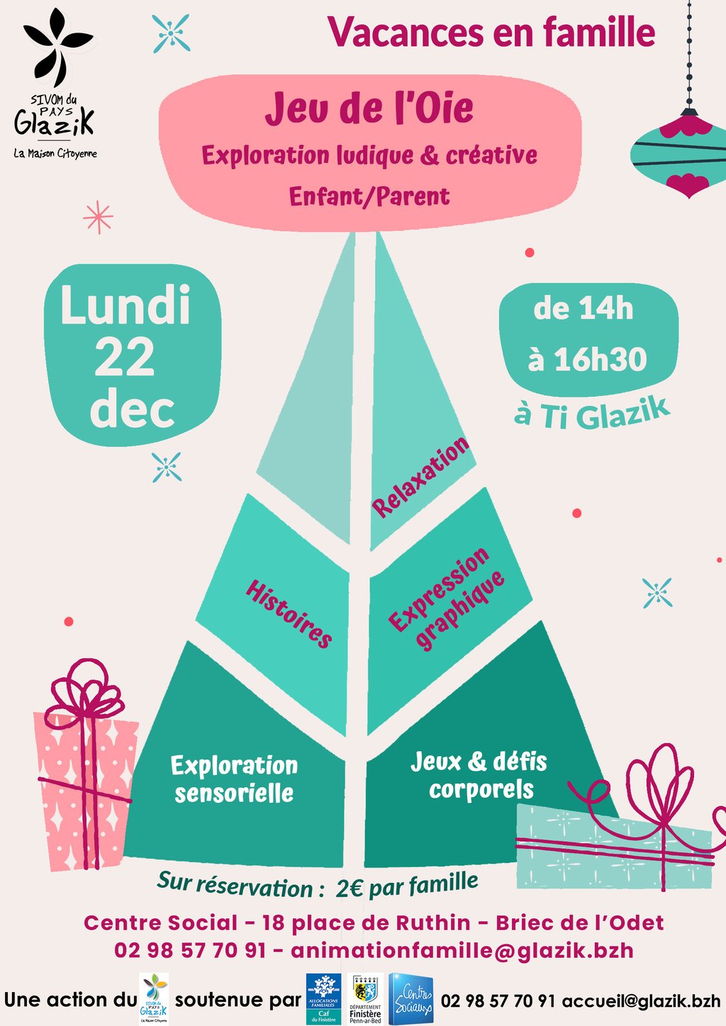 Le Centre Social du Sivom du Pays Glazik propose un atelier parent-enfant autour du Jeu de l’Oie, mêlant découverte, mouvement, imagination et création.