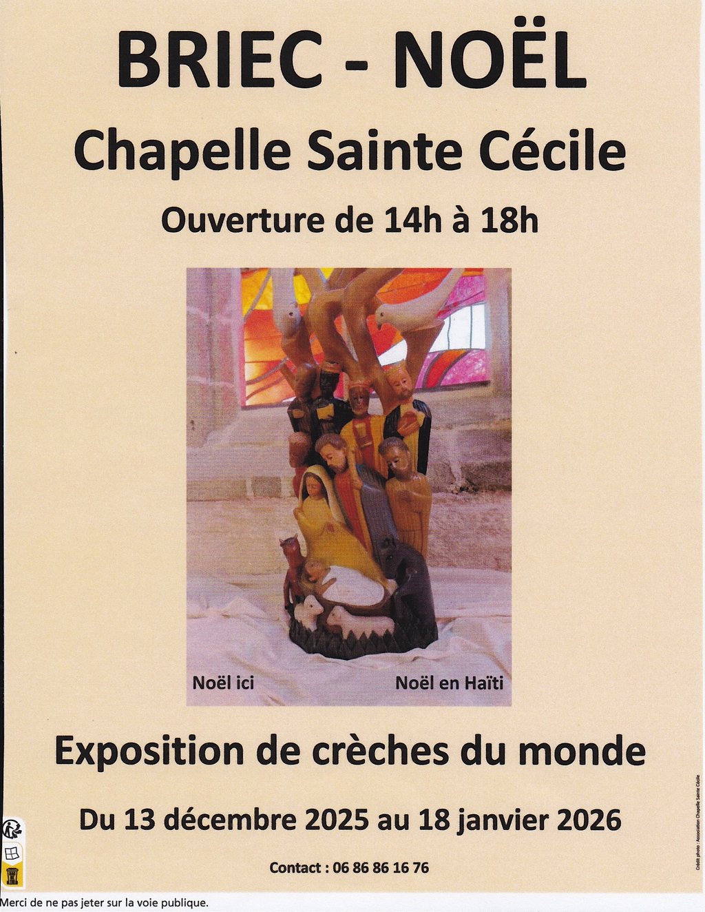 À l’occasion des fêtes de fin d’année, la Chapelle Sainte Cécile de Briec accueille une exposition exceptionnelle de crèches du monde. Venez découvrir la diversité et la richesse des représentations de la nativité.