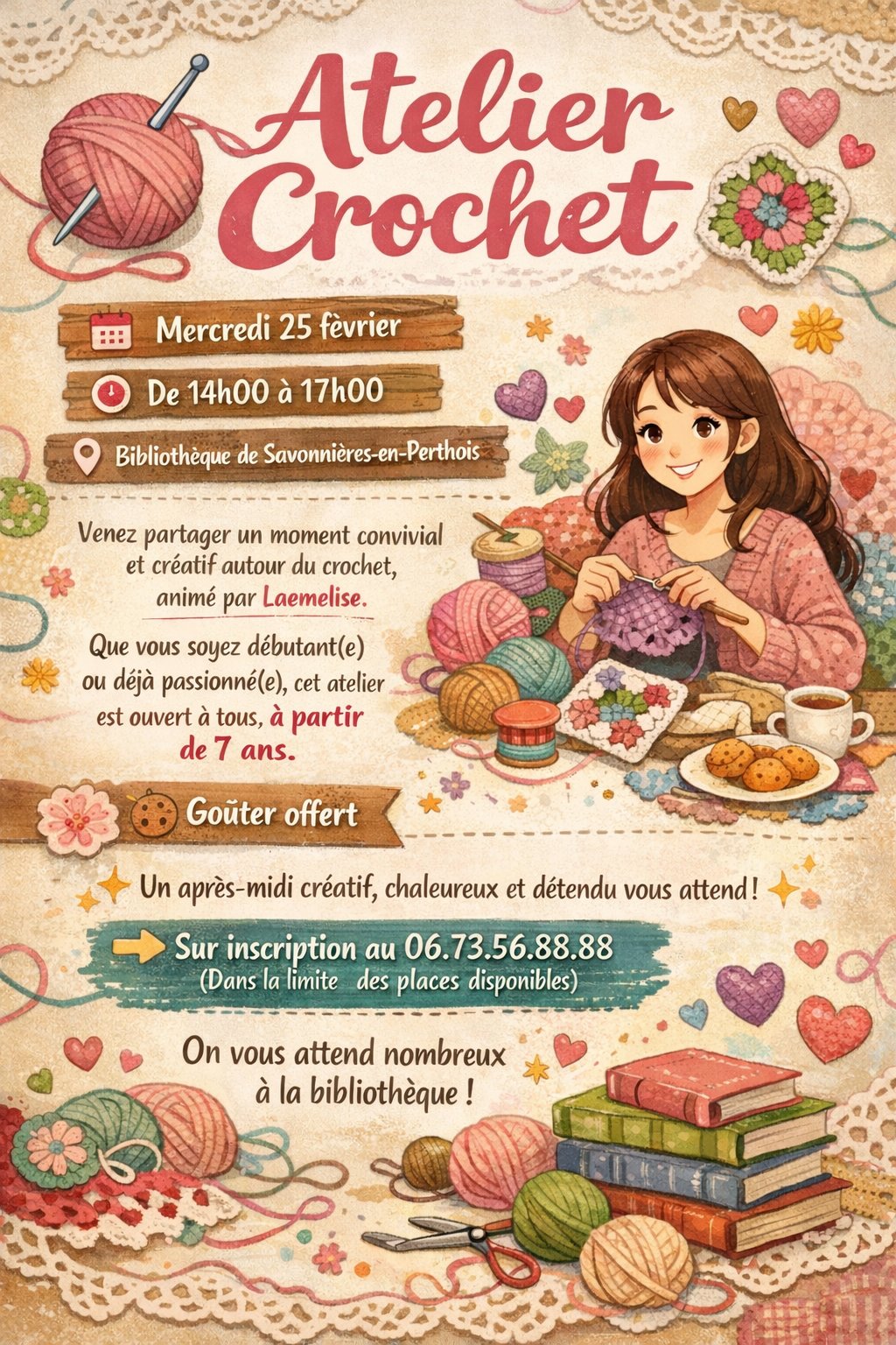 La Bibliothèque de Savonnières-en-Perthois vous invite à un atelier crochet, animé par Laemelise ✨