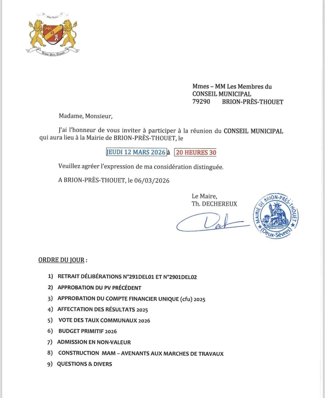 LE CONSEIL MUNICIPAL SE RÉUNIRA JEUDI 12 MARS 2026 À 20H30 À LA MAIRIE