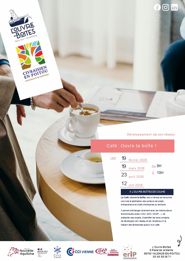 Vous êtes porteur de projet, entrepreneur ou chef d’entreprise sur le territoire ? Venez partager un moment convivial à L’Ouvre-Boîtes de Valence-en-Poitou autour d’un café