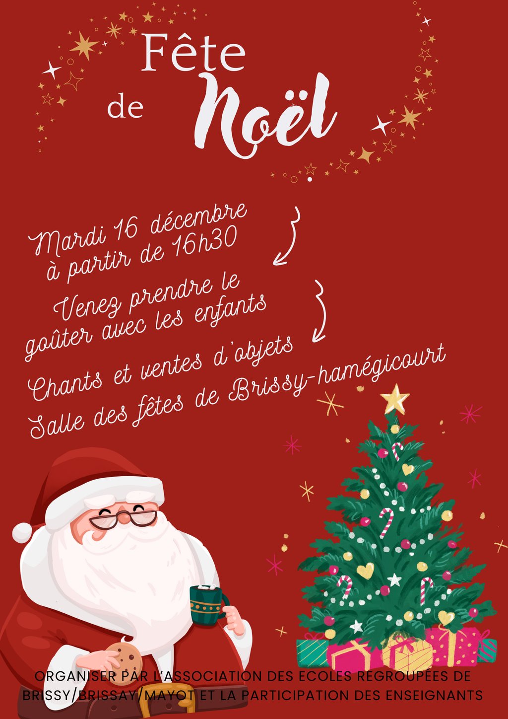 Mardi 16 décembre à partir de 16h30 à la salle des fêtes: chants des enfants, goûter, vente d'objets... Organisée par l'association des parents d'élèves avec la participation des enseignants