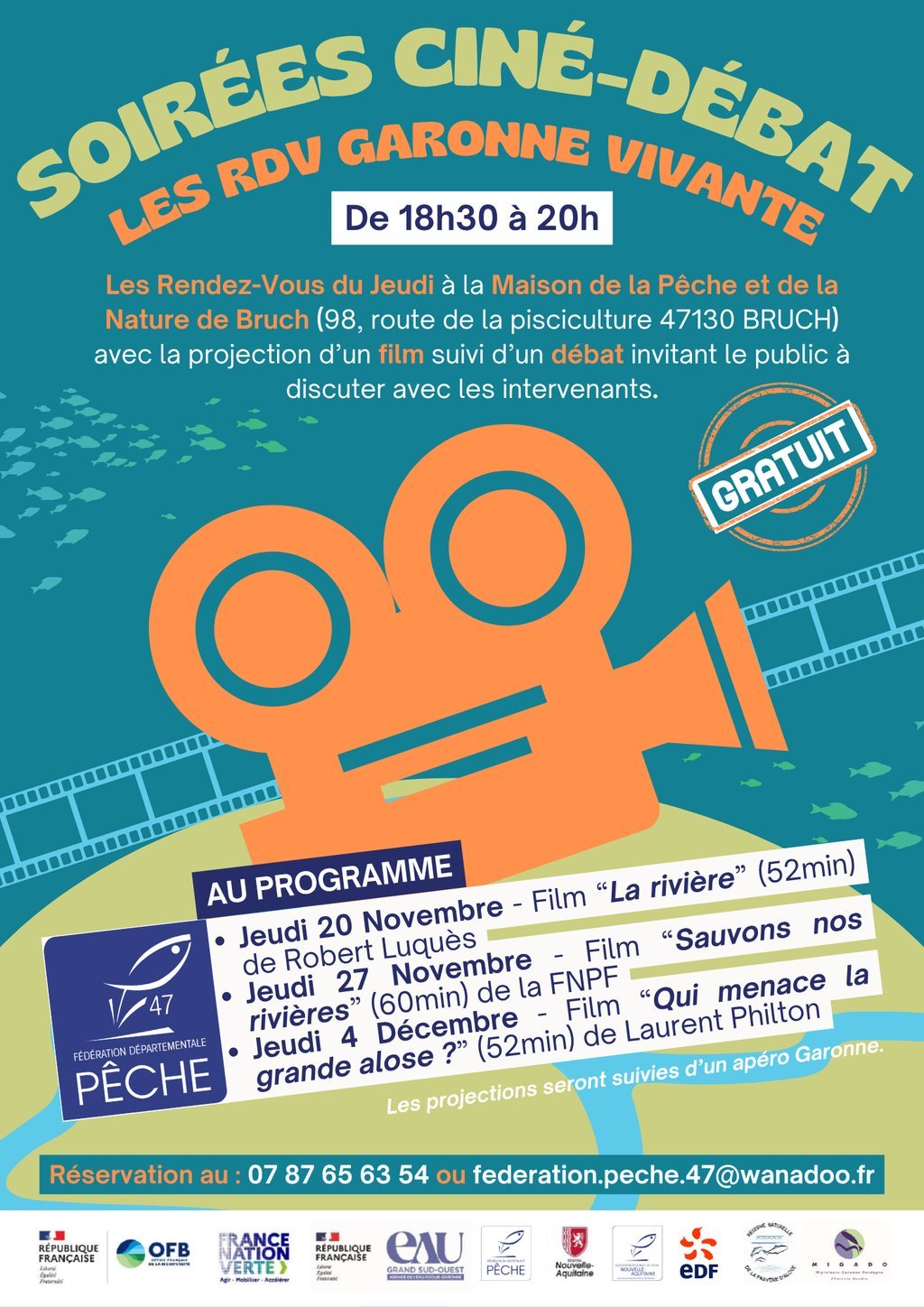 La fédération départementale de la pêche vous invite à ses soirées ciné-débat organisées à la maison de la pêche et de la nature de Bruch.
