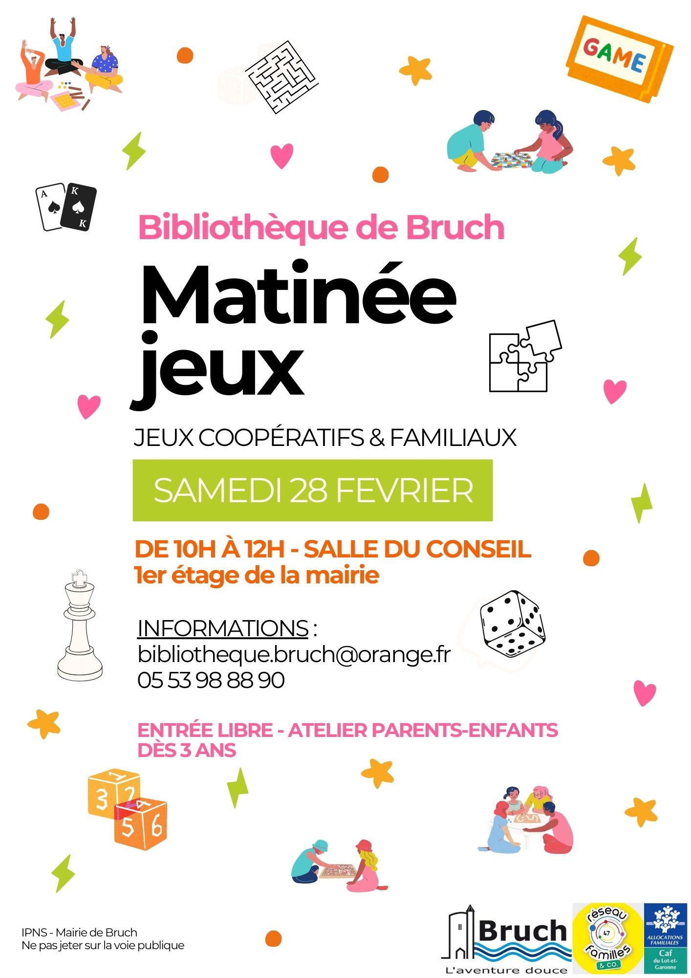 venez nous rejoindre le samedi 28 février de 10h à 12h, pour profiter d'une matinée jeux de société coopératif et familiaux dans la salle du conseil municipal (1er étage de la mairie).