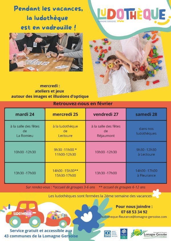 Merci de vous inscrire par mail à ludotheque-fleurance@lomagne-gersoise.com pour profiter pleinement des animations proposées.