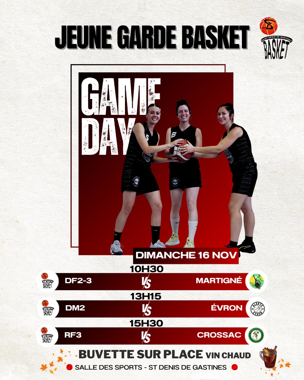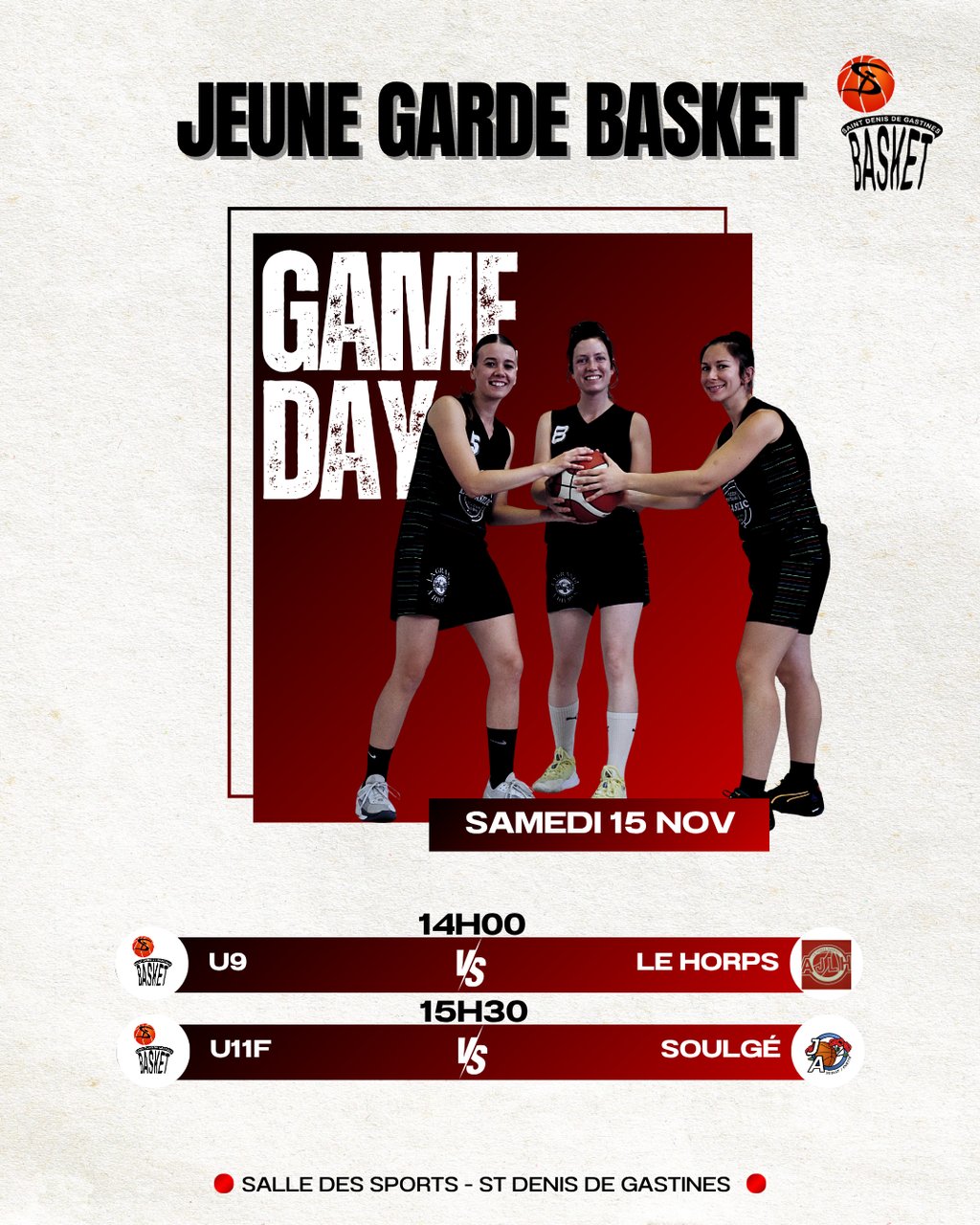 La Jeune Garde Basket vous donne rendez-vous ce samedi 15 et dimanche 16 novembre à la salle des sports de Saint Denis de Gastines pour un week-end 100% basket 🏀