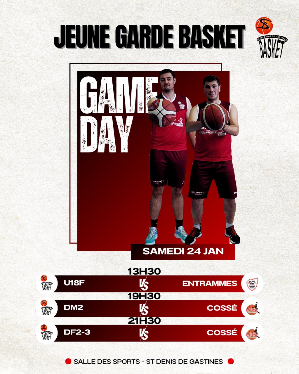 📅 SAMEDI 24 JANVIER  – Salle des Sports, St Denis de Gastines 🔴
