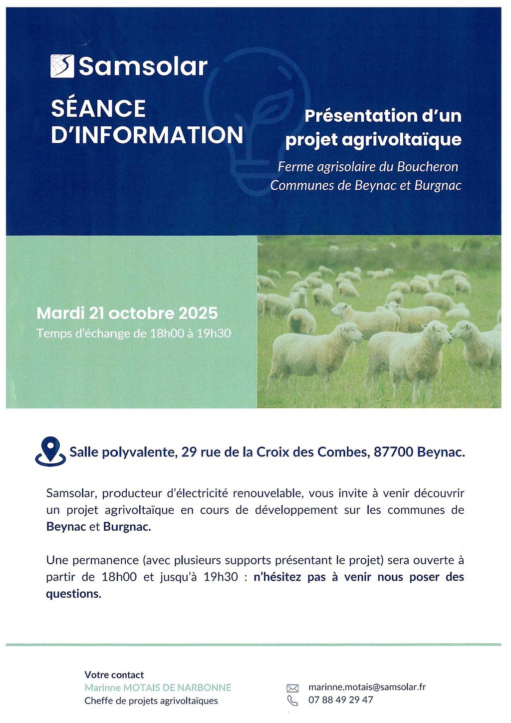 La société SAMSOLAR présentera son projet agrivoltaïque de la ferme agrisolaire du Boucheron, concernant les communes de Beynac et Burgnac.