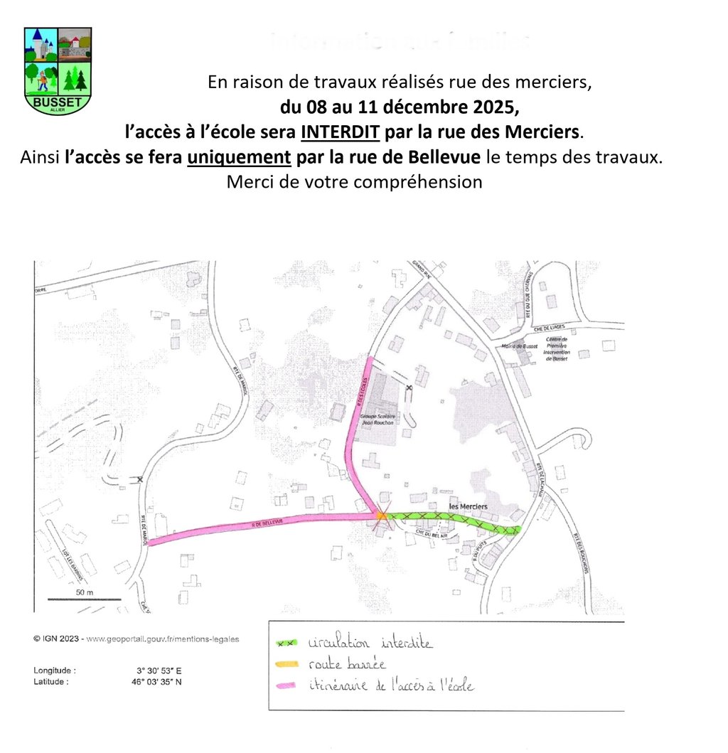 En raison de travaux au 17 rue des Merciers, la rue des Merciers sera barrée au niveau du carrefour avec la rue des écoles. L'accès rue des écoles se fera uniquement par la rue de Bellevue du 8/12 au 11/12 inclus.