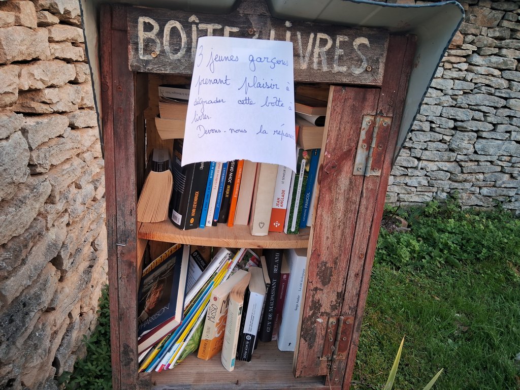 Des jeunes (du village et des villages voisins) ont été aperçu en train de casser la boîte à livres située à proximité de l'abri-bus.
