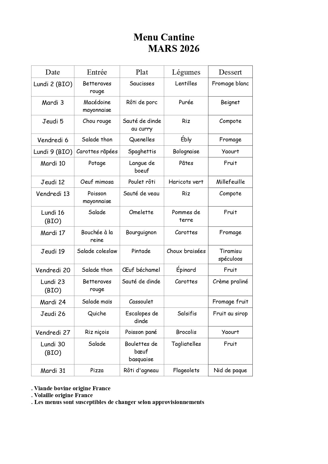 Veuillez trouver le menu de la cantine pour le mois de mars 2026
