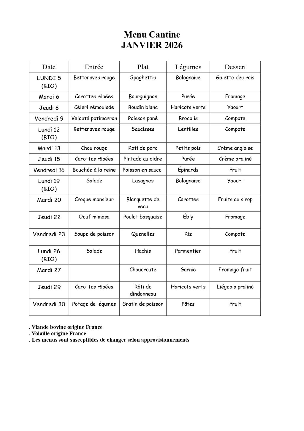 Veuillez trouver le menu de la cantine scolaire pour le mois de janvier 2026.