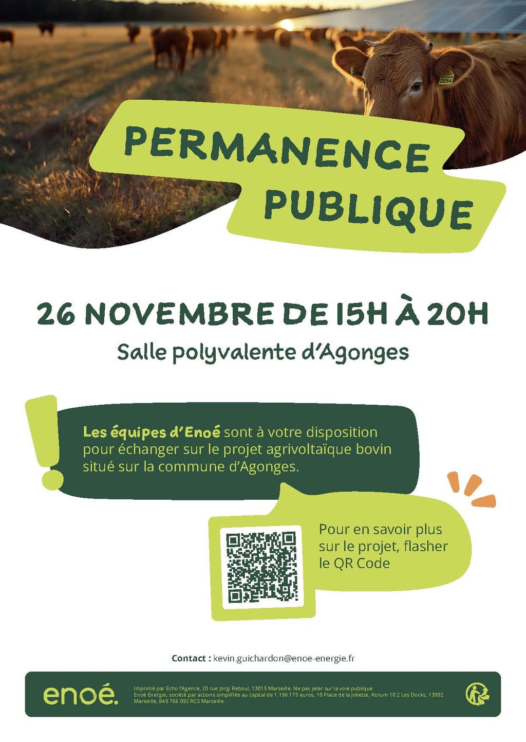 Dans le cadre d’une démarche d’information de la population sur un projet agrivoltaïque à Agonges, l’entreprise Enoé organise une permanence publique le mercredi 26 novembre 2025 de 15h à 20h à la Salle polyvalente d’Agonges. N’hésitez pas à vous y rendre pour prendre connaissance du projet !