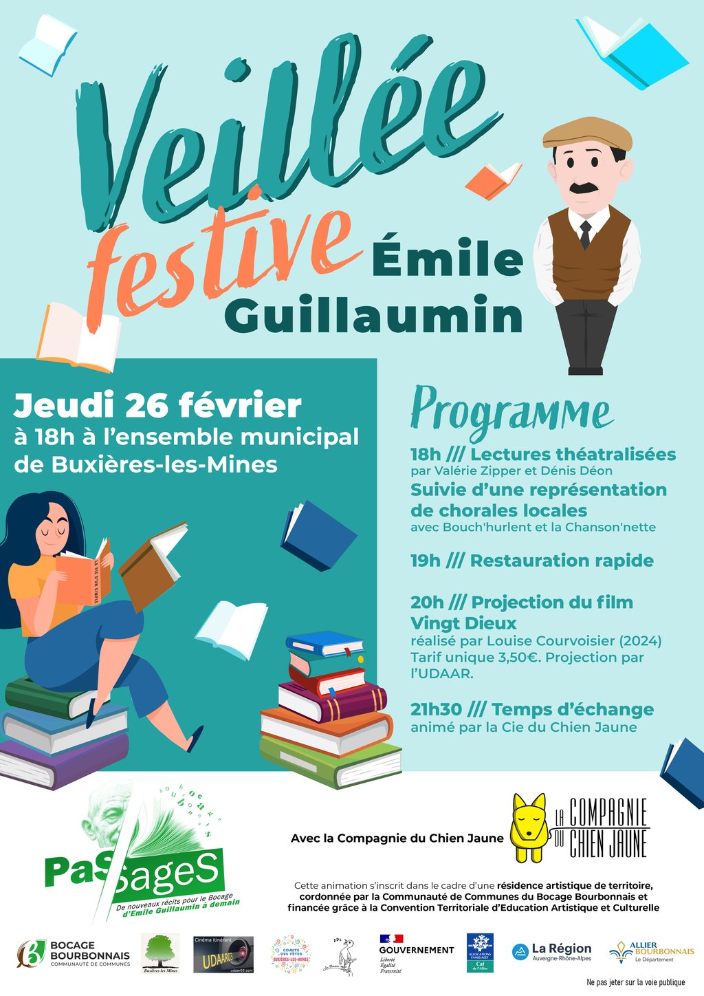 La Com'Com', en partenariat avec l'UDAAR03, les chorales La Chanson'nette et Les Bouch'Hurlent, ainsi que la mairie de Buxières les Mines, vous invite à une soirée conviviale et culturelle exceptionnelle autour de l'écrivain emblématique du Bocage Bourbonnais : Émile Guillaumin !