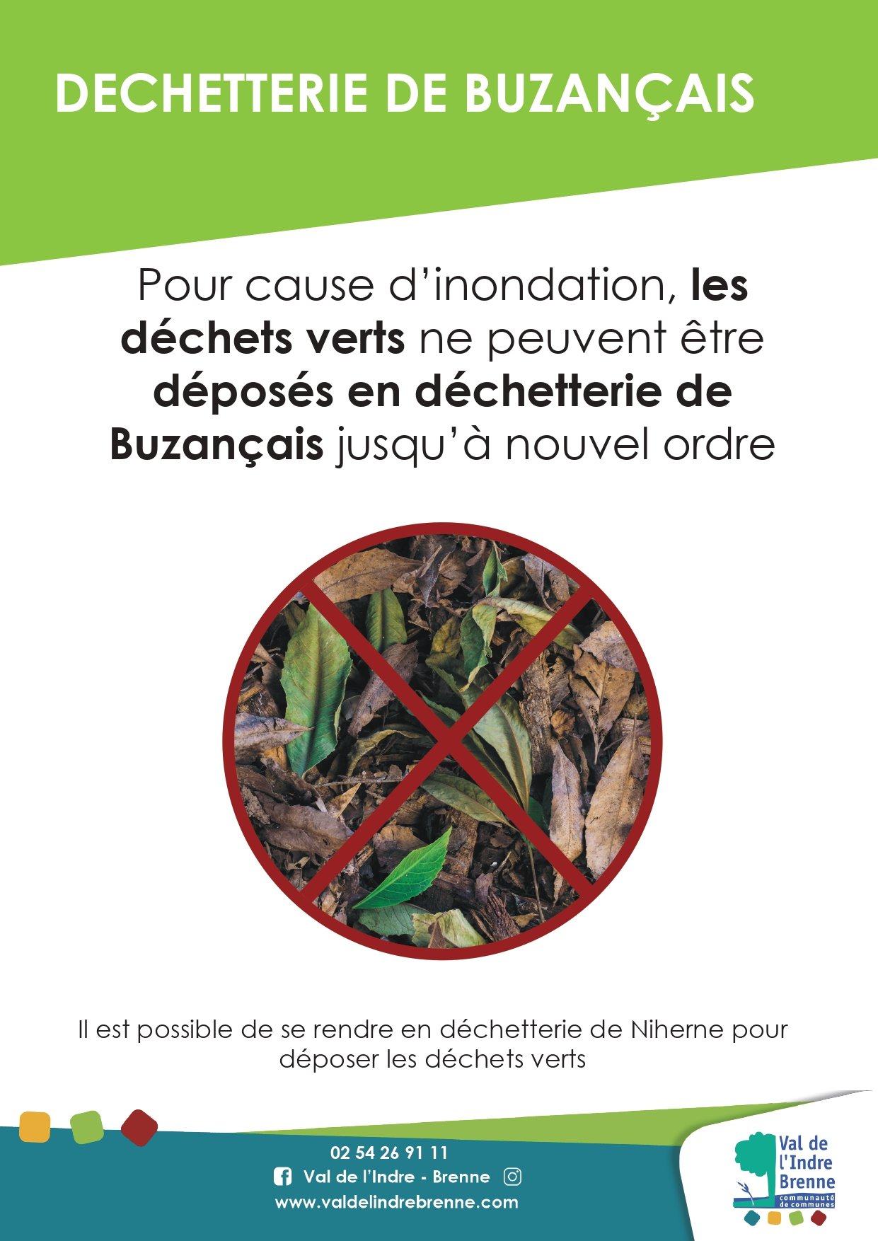La zone de dépôt des déchets verts de la déchetterie de Buzançais est actuellement inaccessible en raison d’une inondation. Il est donc impossible de déposer des déchets verts en déchetterie de Buzançais jusqu’à nouvel ordre.