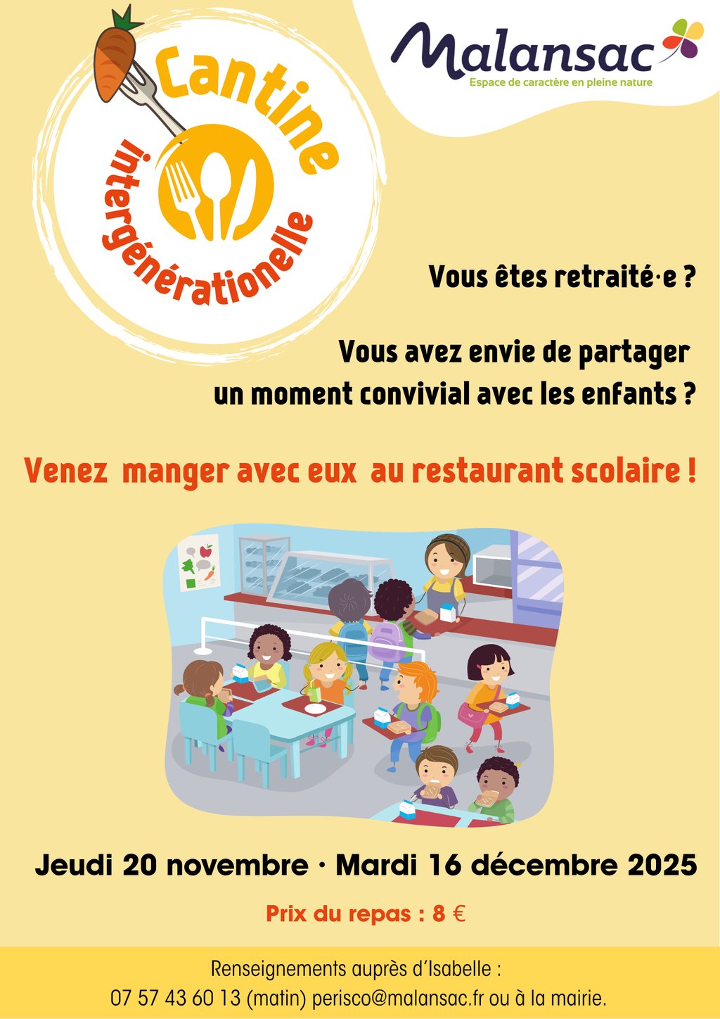 Cantine intergénérationnelle pour les personnes retraitées des communes de Caden et Malansac les Jeudi 20 novembre et Mardi 16 décembre 2025 à la cantine de Malansac