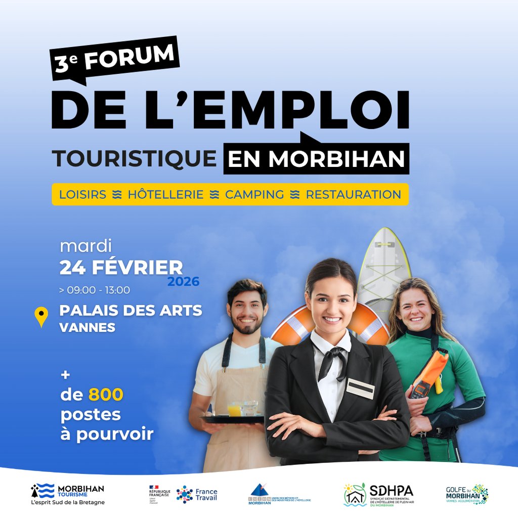 Morbihan Tourisme, en partenariat avec France Travail, la SDHPA et l’UHMI, organise le 3ᵉ Forum de l’Emploi Touristique en Morbihan qui se tiendra le :