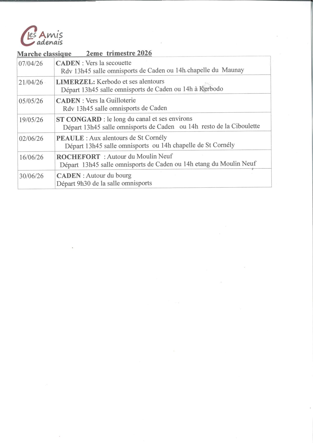 Voici les sorties Marche du mardi proposées par les Amis Cadenais pour le deuxième trimestre.