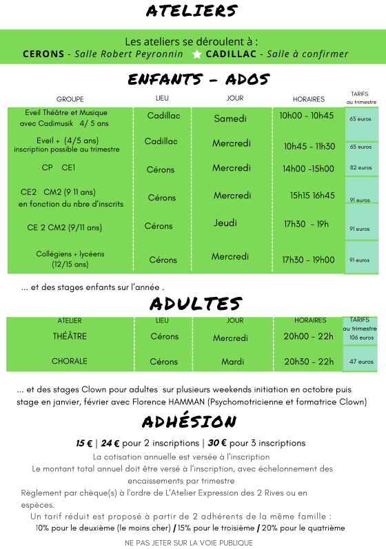 - Pour les plus petits, (Éveils & CP CE1), les ateliers sont des moments pour exprimer ses émotions, libérer son imaginaire et créer des histoires que l'on met en scène. À travers des jeux de théâtre, des costumes et des objets, chacun développe sa créativité, son écoute, sa confiance en soi... Et prend plaisir à rêver et jouer ensemble...
