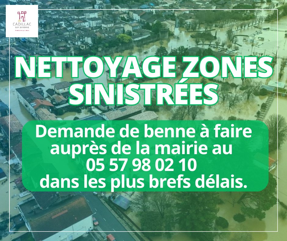 Dans un soucis d'équité pour le territoire, les demandes de bennes pour le nettoyage des zones sinistrées suites aux intempéries doivent être effectuées auprès de la mairie au 05 57 98 02 10 dans les plus brefs délais.