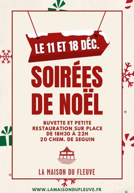 Venez plonger dans la magie de Noël ! Rendez-vous les jeudis 11 et 18 décembre à la Maison du Fleuve, de 18h30 à 22h30, pour des soirées festives et conviviales.