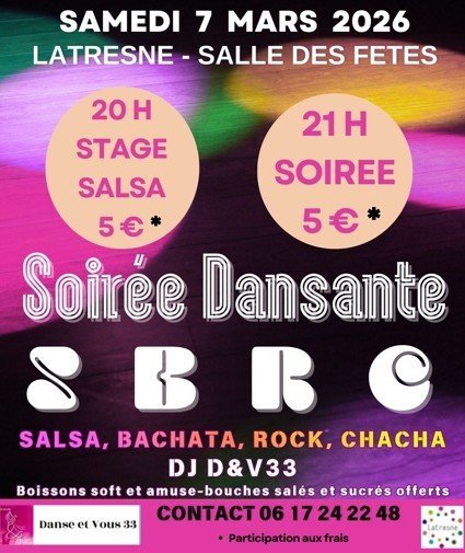 > Musique et soirée animées par "Danse et Vous 33" sur de Salsa, Bachata, Rock et Chacha.