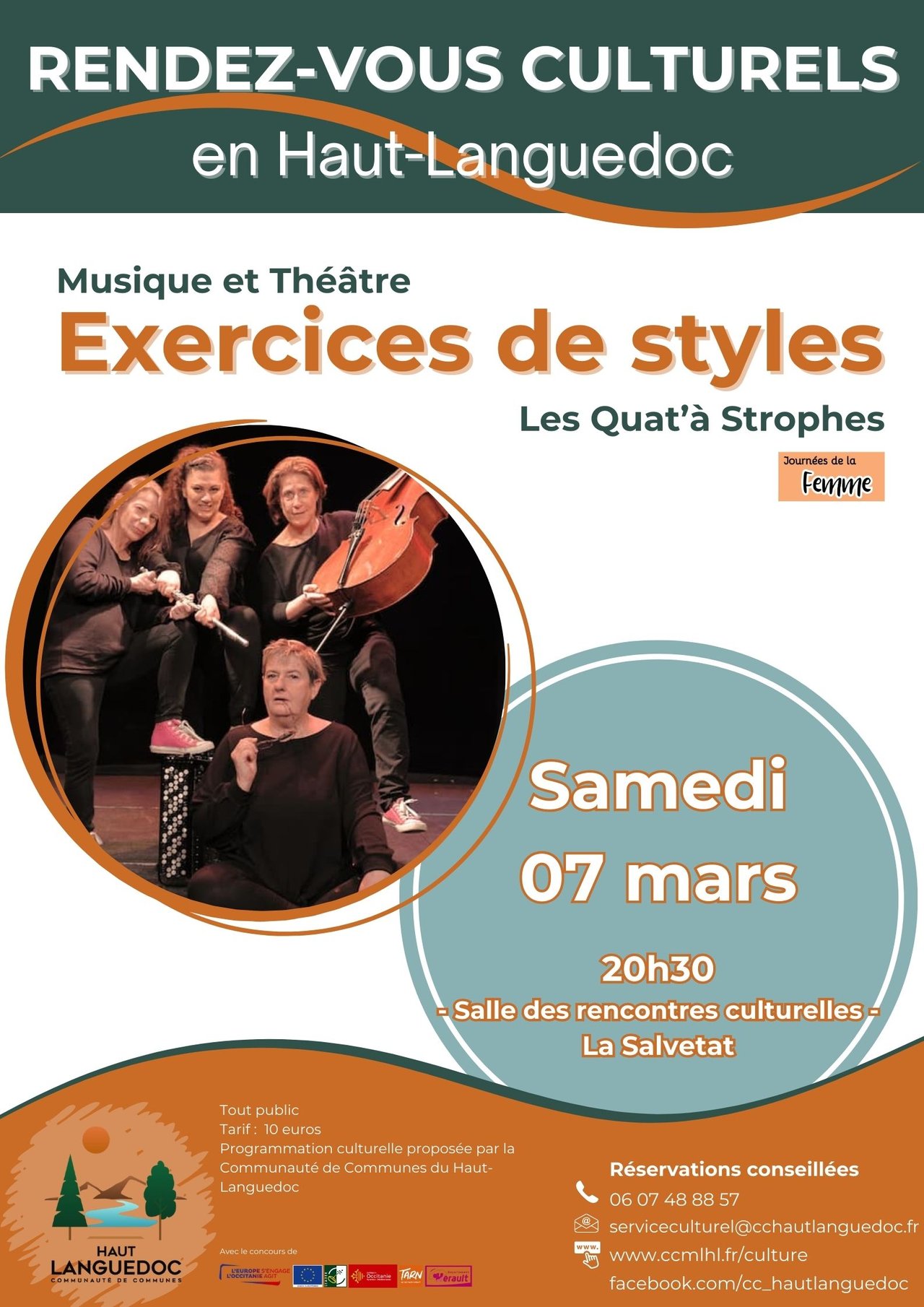 Ces 4 comparses, passionnées de musique et de littérature, adeptes du surréalisme absurde et déjanté du milieu du XX° siècle, sont bien décidées à régaler leur public d'un texte fin et plein d'humour, en incarnant un texte à l'origine assez banal de Raymond Queneau «Exercices de Style» et sur lequel elles s'adonnent à des variations pleines d'imagination et de surprises, entremêlant mots et notes dans un tourbillon de drôlerie poétique.