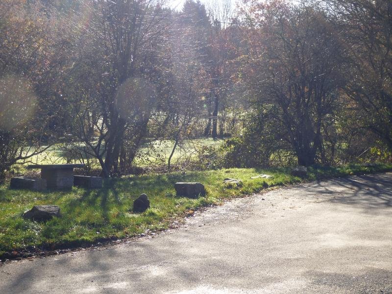 Petite aire ombragée en bord de route. Statue-menhir à proximité.