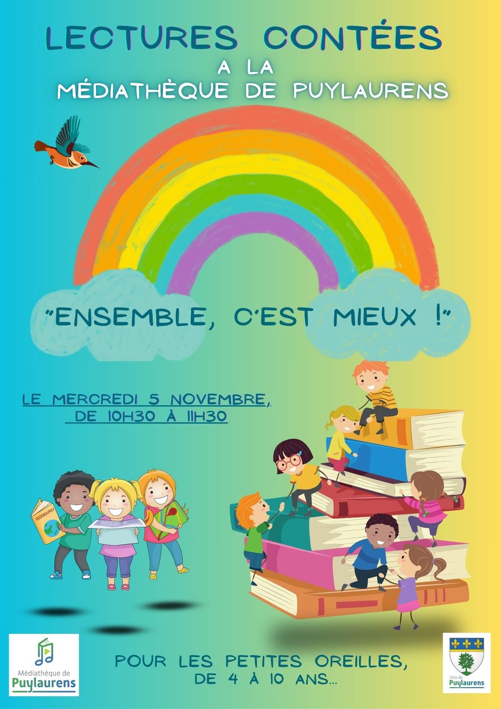 Le mercredi 5 novembre 2025, de 10h30 à 11h30, la médiathèque invite son jeune public à de nouvelles "lectures contées". Au fil de textes choisis, Evelyne racontera aux enfants que "Quand on partage, tout devient plus facile, et "Qu’écouter plus, c'est s'entendre mieux !"