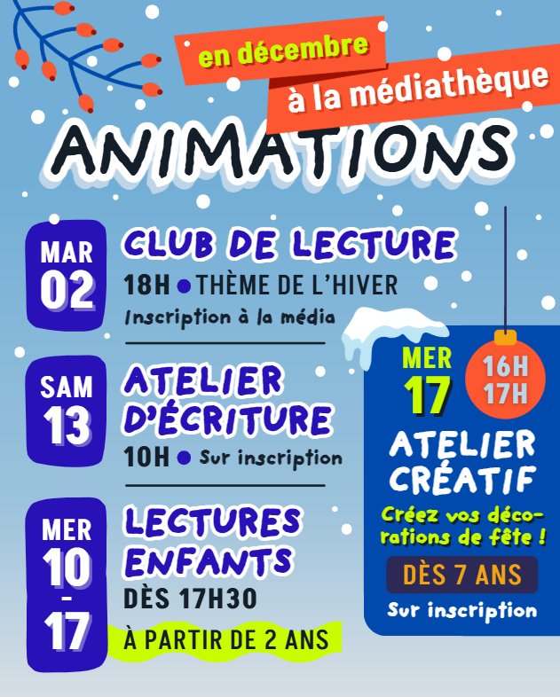 La médiathèque municipale vous a préparé un programme chaleureux pour célébrer la fin d’année. Entre culture et création, venez vous amuser et partager la magie de l’hiver !