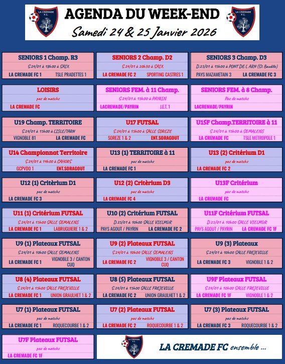 Ci joint l'AGENDA FOOTBALLISTIQUE du 24/25 JANVIER 2026