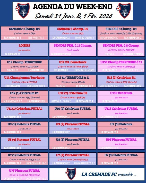 Ci joint l'AGENDA FOOTBALLISTIQUE du 31 JANVIER et 01 FEVRIER