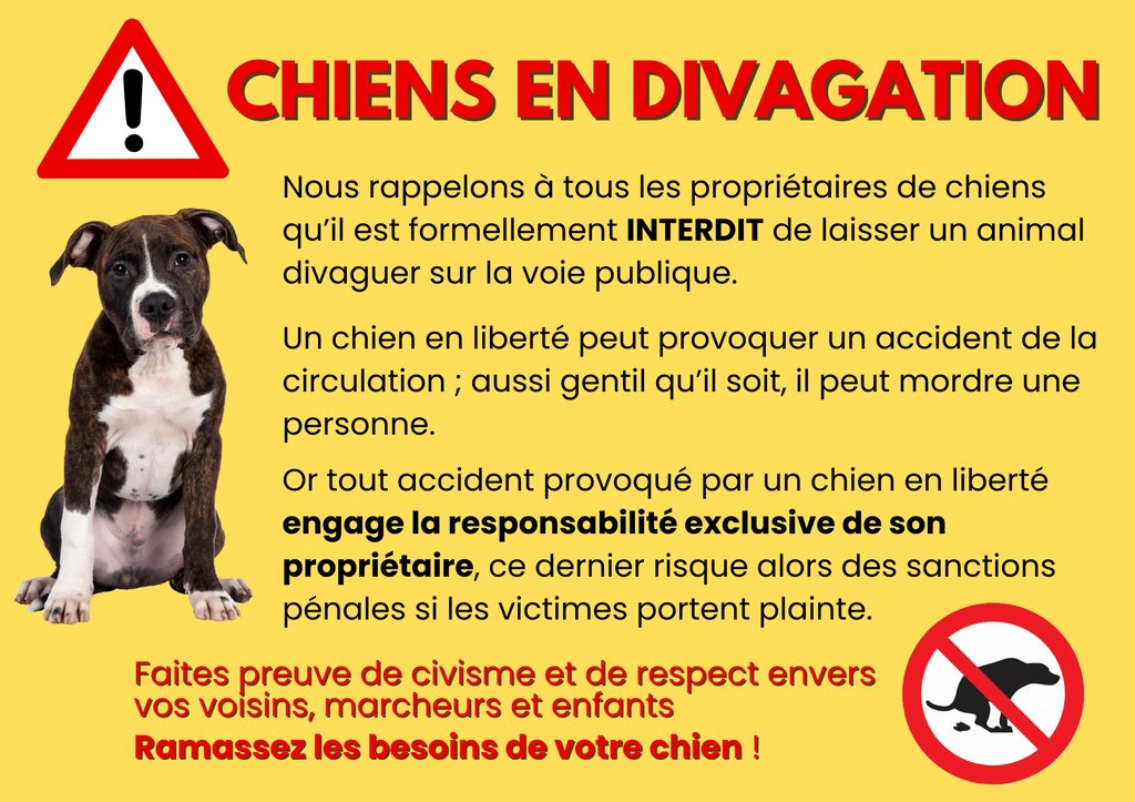 Nous rappelons à l’ensemble des habitants que la divagation des chiens est strictement interdite.