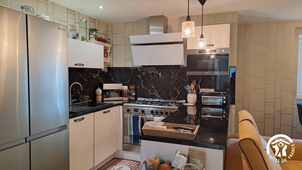 * cuisine avec réfrigérateur américain, piano de cuisson avec four, lave-vaisselle, micro-ondes, grille-pain, cafetière avec café moulue qui fait dosettes et café filtre, blender, hachoir, mixeur-plongeur, siffon, batteur...