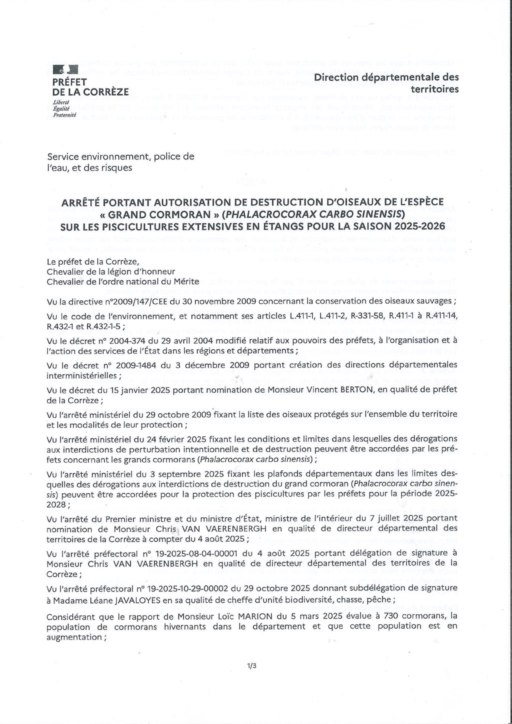 ARRETE PORTANT AUTORISATION DE DESTRUCTION D'OISEAUX DE L'ESPECE "GRAND CORMORAN"