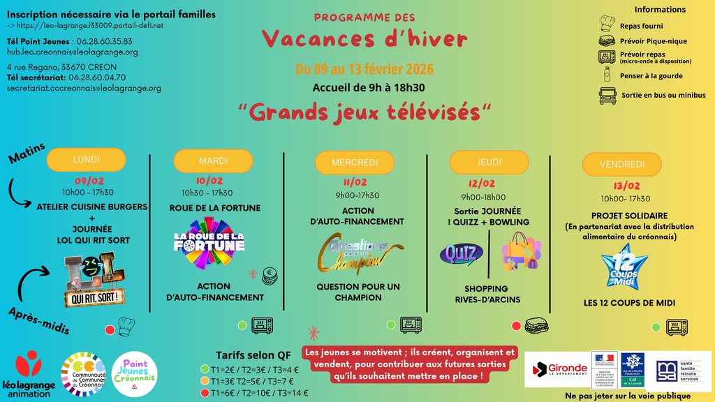 Le Point Jeunes Créonnais vous propose deux semaines riches en animations. Ateliers de cuisine, jeux, quizz, jeux vidéo, ateliers créatifs, loto, patinoire... et bien d'autres activités !