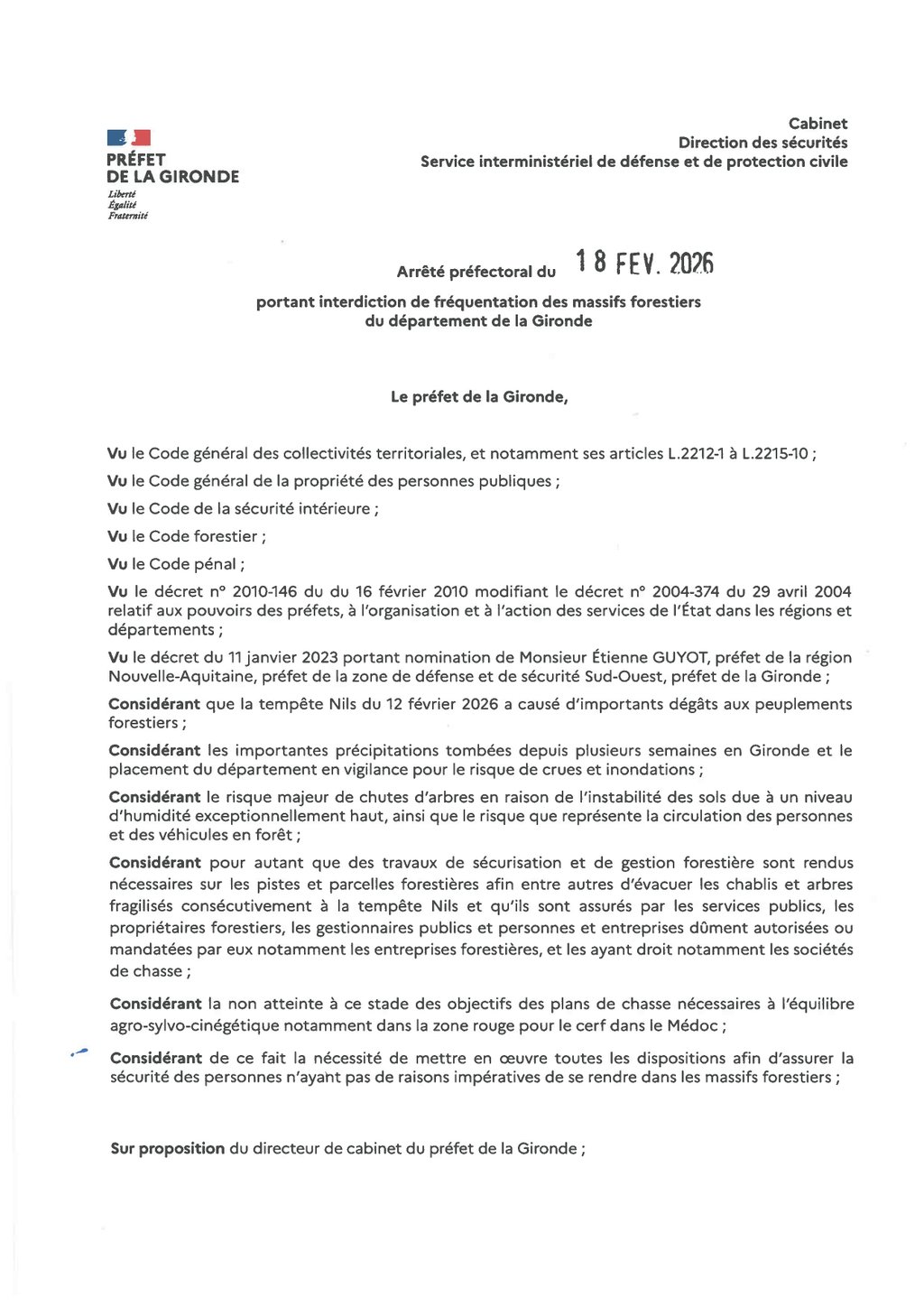 Arrêté départemental visant à l'interdiction de fréquentation des espaces forestiers du 18 au 23 février 2026 (sauf nouvel arrêté).